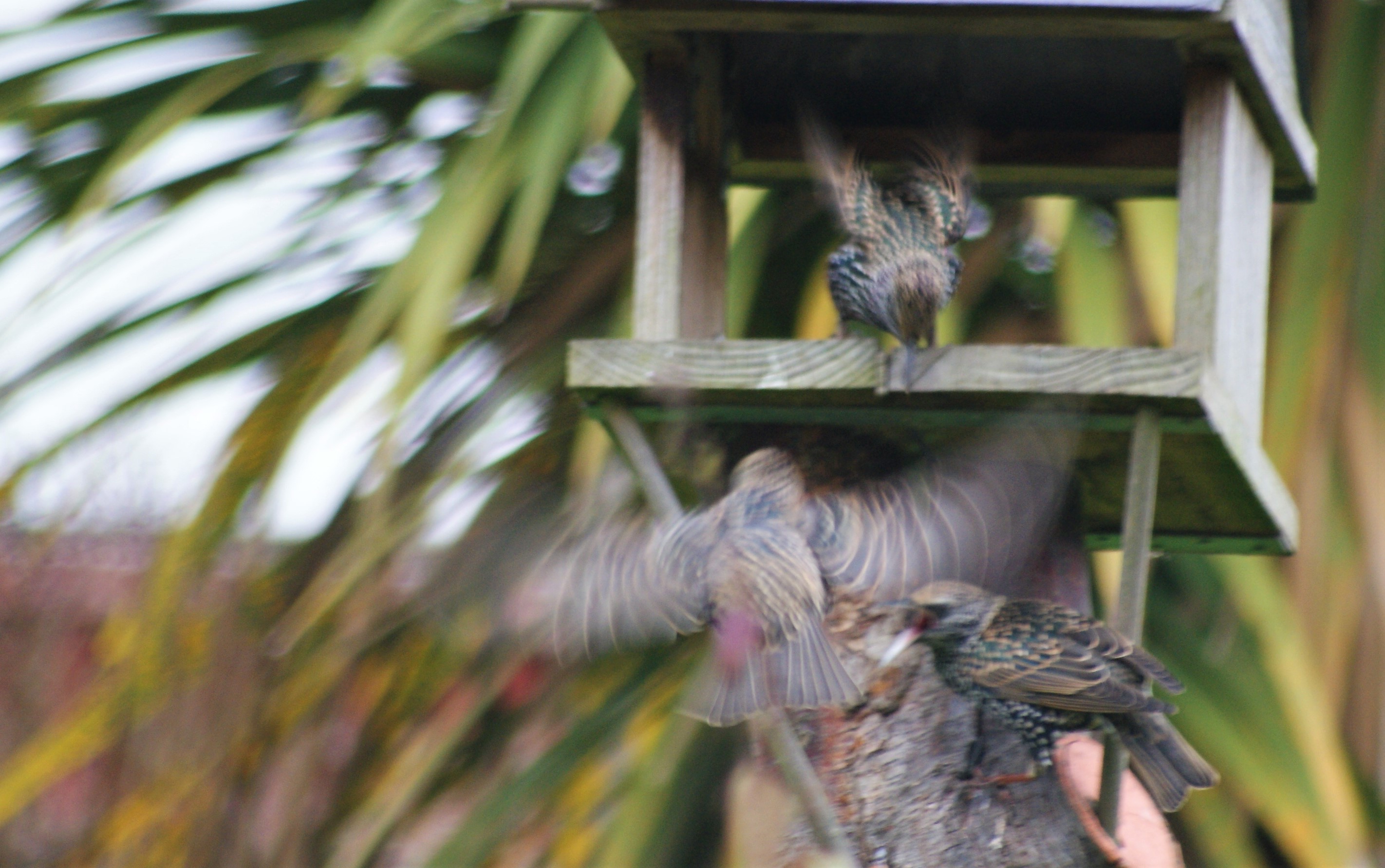A squall of starlings Blows up suddenly, raining Beaks and talons now